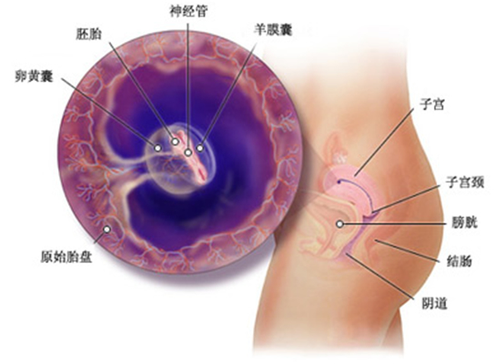 进入孕 5 周,胚泡在子宫内着床后,就会向四周扩展,一端的细胞团内开始有一层从靠近囊胚腔的扁平细胞分化出来,成为胚胎原始内胚层。其余较大的细胞就变成柱状细胞,形成胚胎的原始外胚层。原始内、外两胚层是呈现出圆盘状,称为胚盘,胚盘长约 2 毫米。 经过一段时间的发育,到 4 周末时在胚盘内、外两胚层之间,由外胚层分化出一层细胞,形成胚内中胚层。到现在为止,三胚层就形成了,三胚层是胎体发育的始基。
