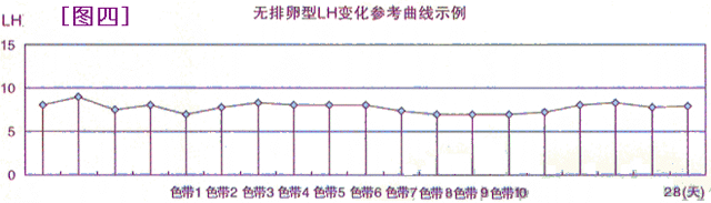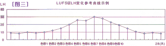 图三为 LUFS 征(卵泡黄素化)的图示。 随着卵泡的增大,尿 LH 缓慢的增加,LH 值一直在 25-50IU/L 之间波动,无峰值出现,中低水平的 LH 可维持 5 天左右,同时黄素化的卵泡不断地长大。与正常排卵时尿 LH 值上升的陡峭高峰状曲线完全不同。